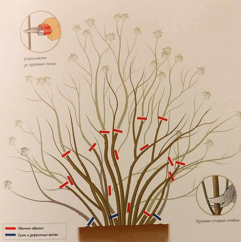 Når busken har falmet og høsten kommer, er det på tide å begynne å beskjære. Gamle busker beskjæres og etterlater hamp med 2-3 knopper. På unge busker fjernes tykkende kroner eller syke skudd.