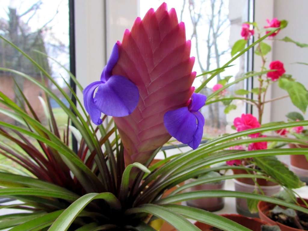 - Tillandsia fiolettblomstret. Utad ligner koraller. Rosettene er små, opptil 5 cm, bladene er tynne, buede, knoppene er fioletteblå, og de grønne bladene blir vanligvis rosa under blomstringen.