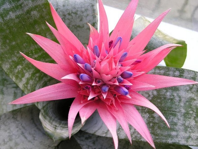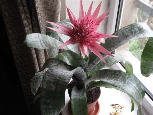 Hvordan blomstrer ehmeya? På en massiv peduncle som ligner på en pil, vises blomsterstand i form av et øre eller et bånd. Skytten ser mer imponerende ut enn selve blomstene. Den kan ha en rik rød eller rosa farge.