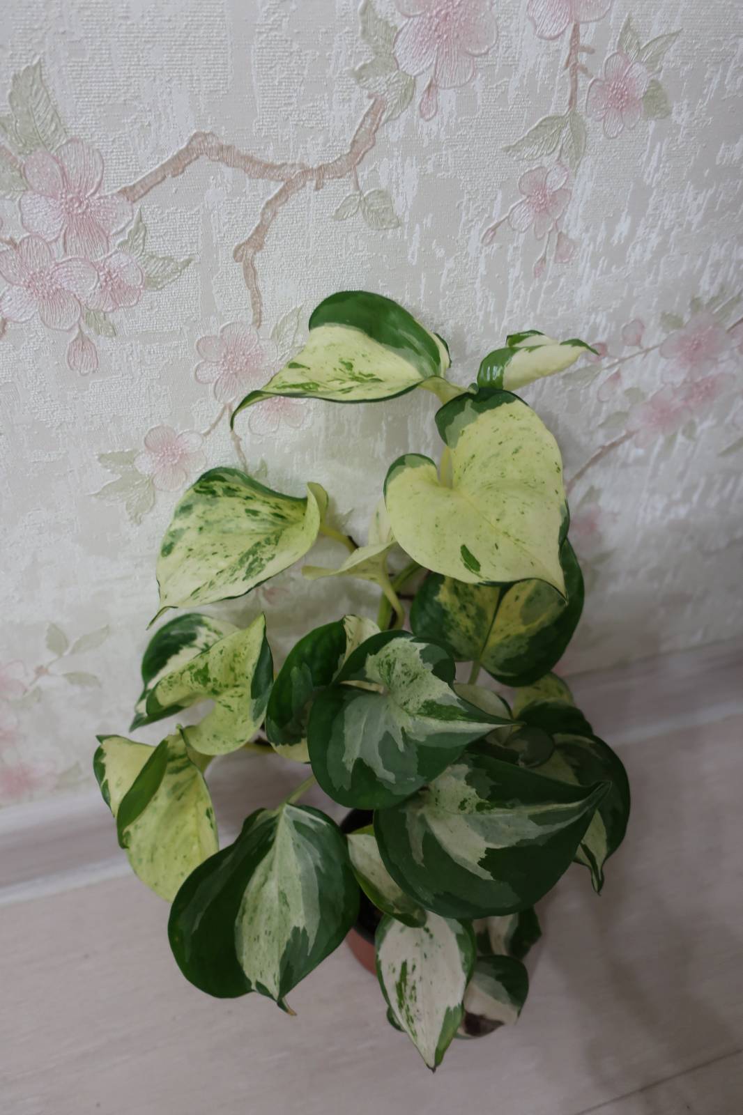 Et annet utvalg av gylden epiprenum, scindapsus marmoreple, er veldig sjelden. Mønsteret på forskjellige blader er annerledes: noen er helt dekket med en hvit flekk, andre er halvparten eller nesten upåvirket. Størrelsen på den vegetative delen er den samme som Marble Queen. I noen kilder kalles epipremnum marmoreple Thai scindapsus.