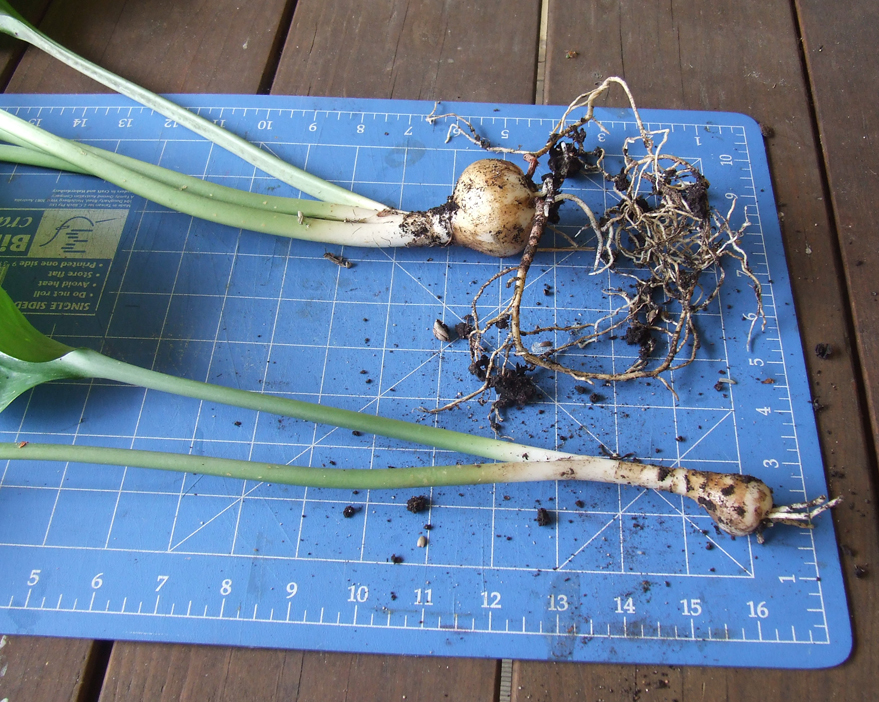 - før plantingen kuttes restene av bladene i en høyde på 1 cm over pærehalsen;