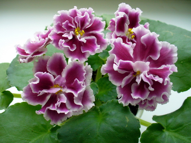Rosetten på blomsten sprer seg ganske (opptil 40 cm), består av lange bladblad som store, saftgrønne fleecy bladplater er festet på. Blomstene når 6 cm i diameter, dyprosa med en hvit kant langs bølgekanten.