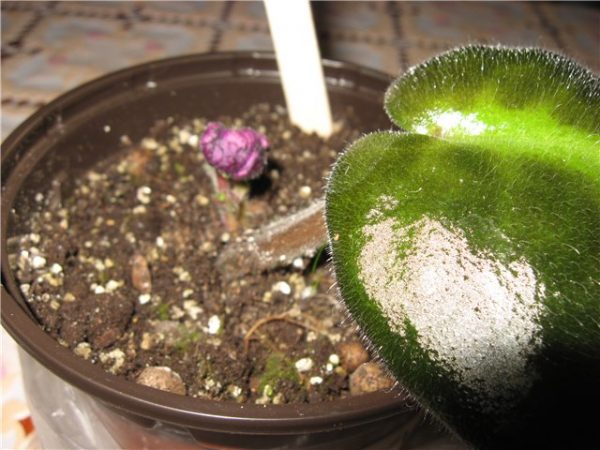 Hvis det vises en grå blomst på bladene, betyr dette at blomsten er smittet med mugg. Dette kan skyldes dårlig belysning, overdreven fuktighet eller mangel på fosfor i jorden. Behandlingen er å spraye bladene med spesielle preparater som inneholder kobber.