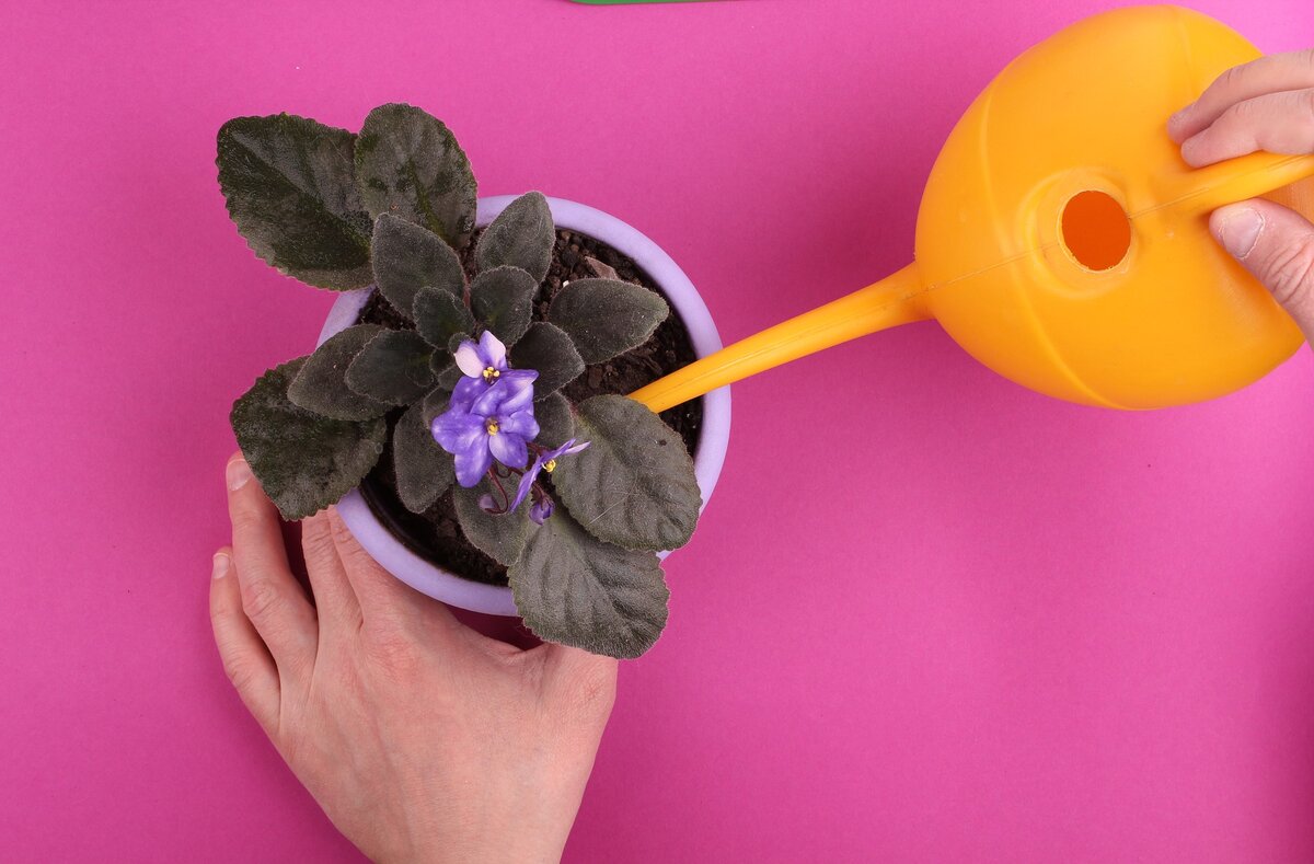For å øke luftfuktigheten sprayes vann ved siden av den fiolette busken, bladplatene tørkes forsiktig med en fuktig klut.