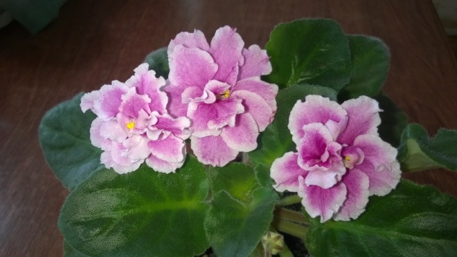 Den blomstrer voldsomt og er veldig vakker. Den rosa frottéfioletten har store blomster. Lilla flekker er merkbare langs kantene. Kronbladene er bølgete, med en lysegrønn kant i kantene.