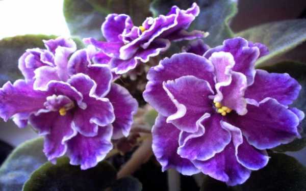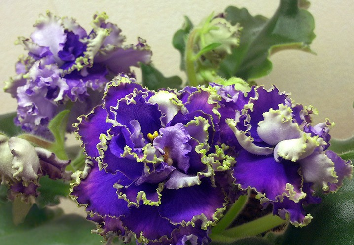 En fiolett fiolett med en grønn kant ser veldig vakker ut. Blomstene er store, de er halv-doble og doble.