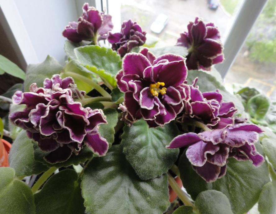 Blomster av denne sorten skiller seg fra de vanlige, de ser mer ut som små roser. Mange kronblader, som ligner på en sky med en dypblå kveld, åpnes gradvis som en rosa knopp, mørkere på forsiden og mye lysere på innsiden. Peduncles - forgrening, mange. Som et resultat ser den kompakte kronen ekstremt elegant ut. Bladene av denne sorten er mindre enn de vanlige Uzambara Saintpaulia, har en lysegrønn kant langs den takkede kanten, og fra innsiden og ut er de mye lettere med rød-burgunder årer.