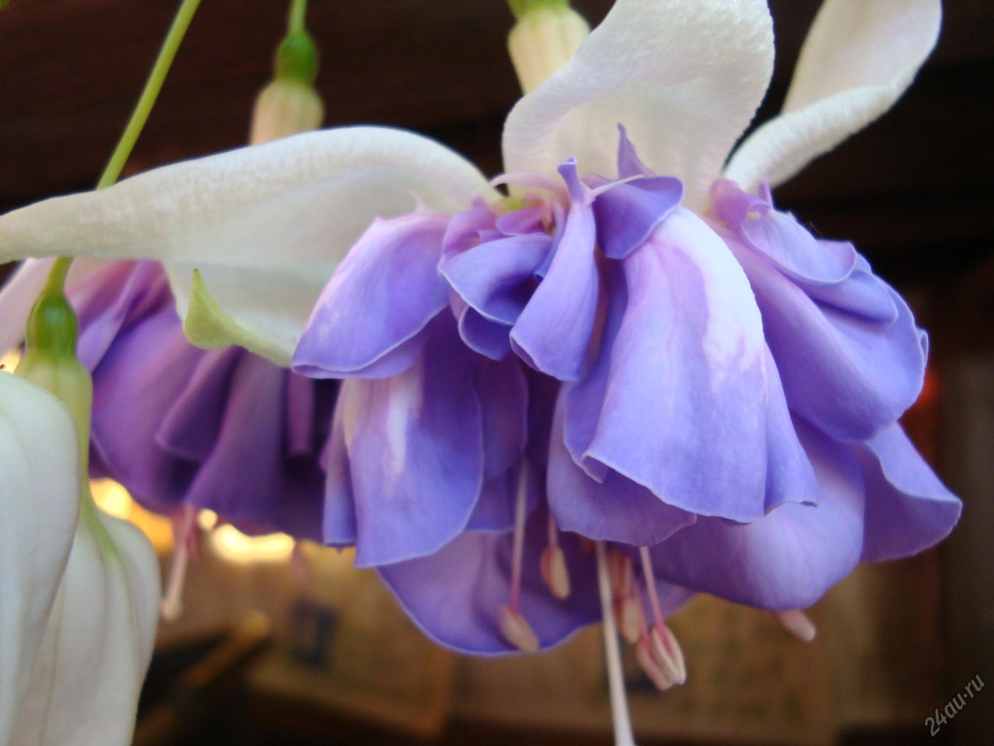 - hvite kelkblad. Det er en gradering i fargen på skjørtet - en overgang fra mørkeblå til lysere, ametyst;
