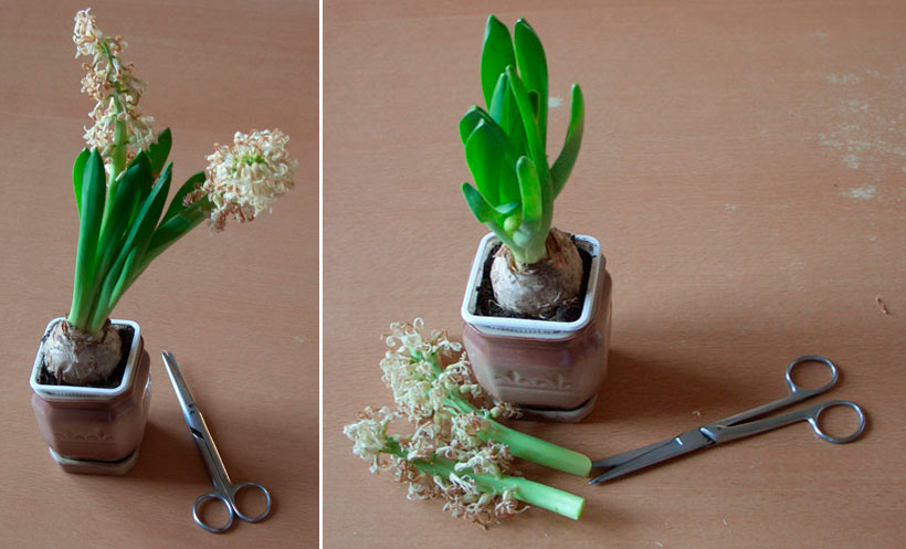 Etter blomstring begynner hyasinten å visne.Først dør pedunkelen av, deretter bladene. Den første må fjernes før eggstokken vises, ellers vil pæren bruke energi på dannelsen av frø, noe som ikke er nødvendig for øyeblikket. Beskjæring utføres umiddelbart etter at blomsten er gravd ut av bakken. Fremgangsmåten er nødvendig for å fjerne overflødig vev. Ulike skadedyr eller parasitter kan være igjen på dem, noe som ikke tillater at pæren bevares i hviletiden. Stammen er kuttet helt, og etterlater bare en liten stubbe.
