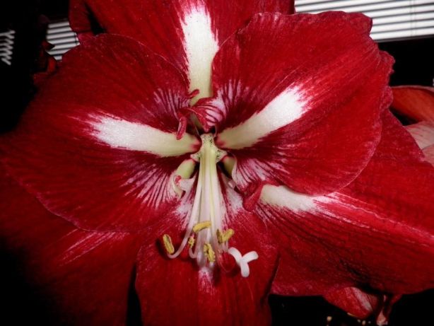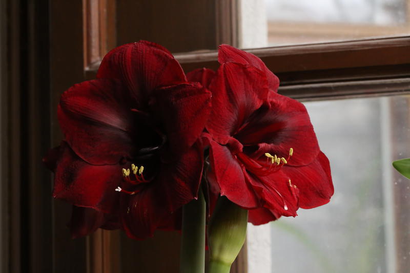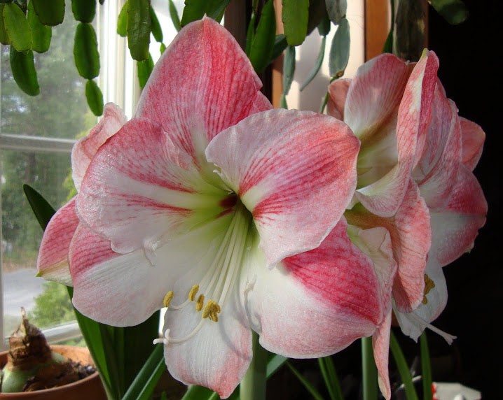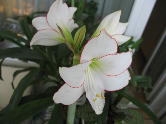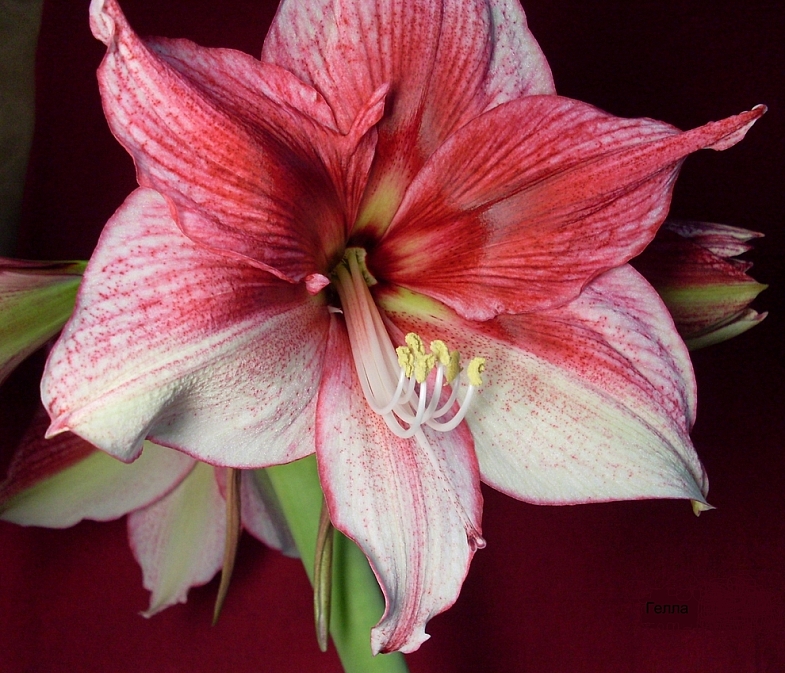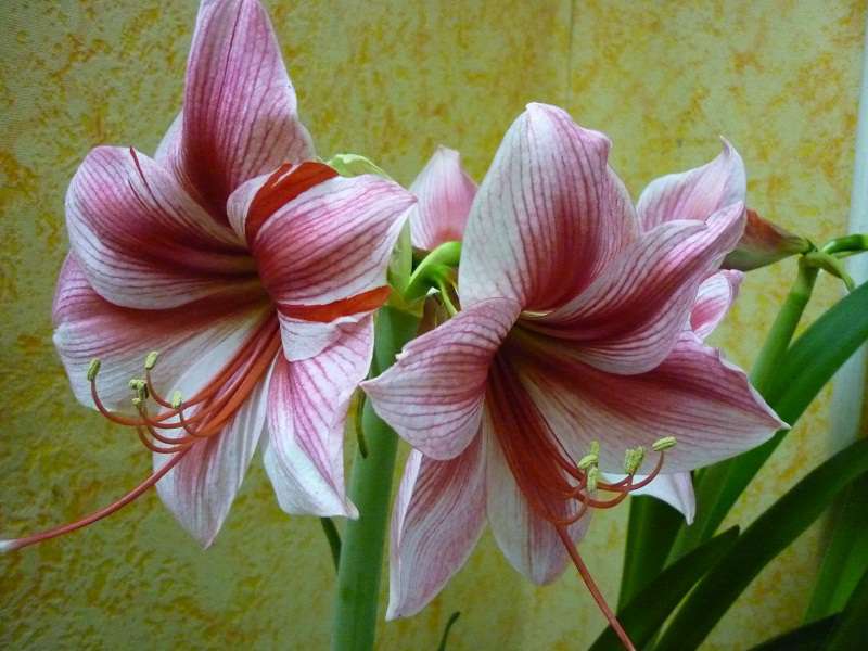 Stammerne er hvite, rødlige i fargen. Nærmere blomstens hals skifter fargen til rød. Pedunkelen er kraftig, lang. Blader av en vakker mørkegrønn fargetone. Planten blomstrer om vinteren, omtrent 2 måneder etter planting.