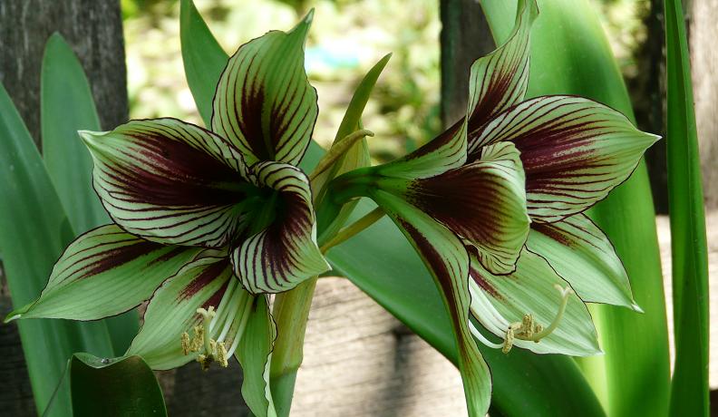 Planten vokser opp til 60 cm i høyden. Diameteren på pæren når 10 cm, den har en lang nakke. Bladene er dypgrønne, belteaktige. Peduncle er lang, har 2, sjeldnere 3 blomster, ligner på en orkide, eplegrønn, med brune eller kirsebærstriper. Flere indre orkideformede kronblader krølles nedover.