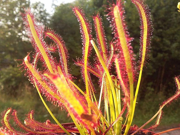 På slutten har villi en fortykning med en kjertel som utskiller klebrig slim med en delikat søtaktig aroma. Tiltrukket av glitteret fra dråpene og den behagelige lukten, sitter insekter uten frykt på bladet og setter seg fast i den klebrig overflaten. Den kjøttetende planten reagerer umiddelbart på berøring.