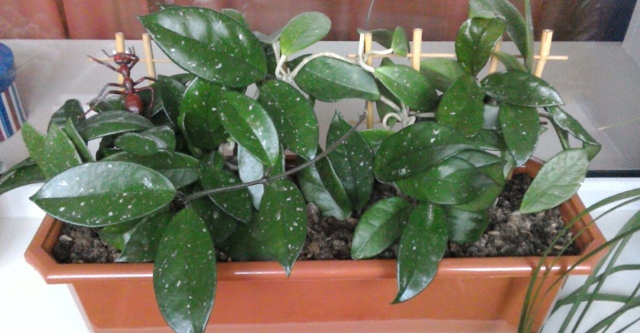 - Hoya Macrophylla vokser godt i huset. Bladene er store, opptil 15 cm mørkegrønne med gule flekker. Stiger raskt på en vertikal støtte. Rosa blomsterstand i form av stjerner. Lukten er søt, mest følt på kvelden.
