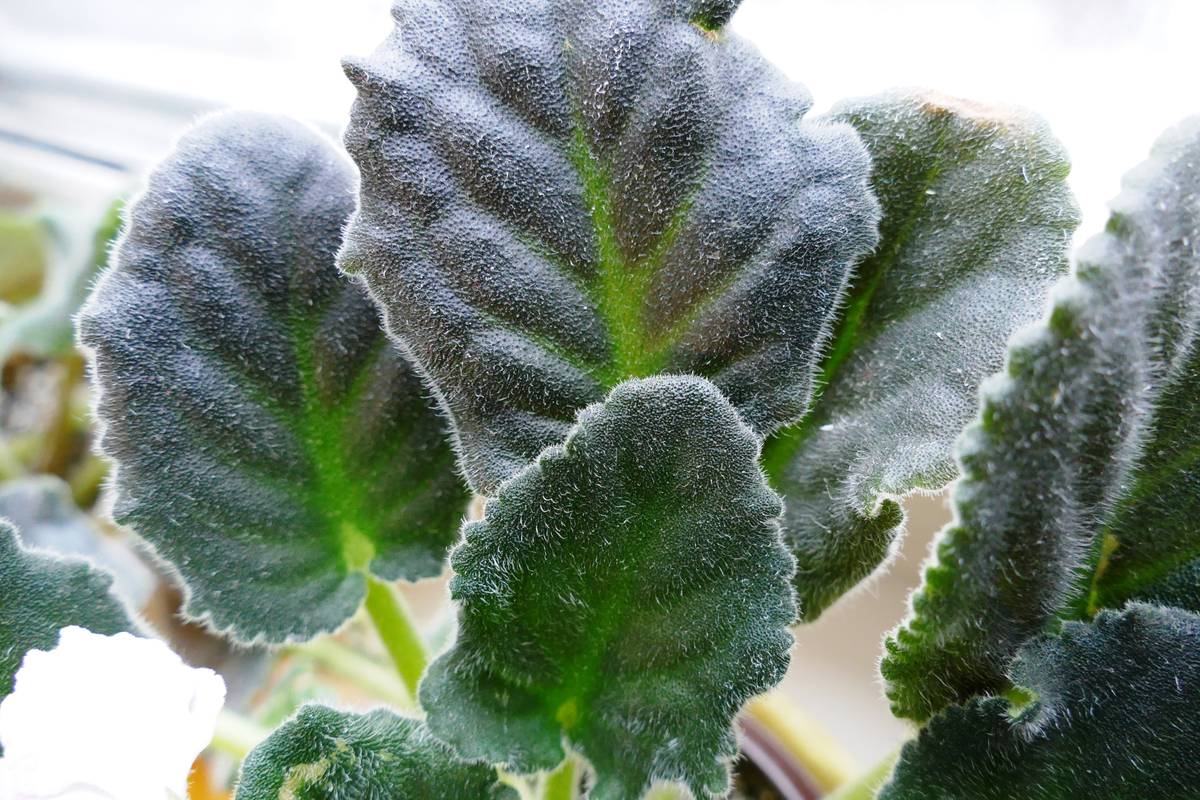 Stammen til den fiolette er grønn. Bladene kan være lysegrønne til mørkegrønne. Noen ganger er det hvite med en mørk kant eller broket med forskjellige mønstre. Innsiden av arket kan være drastisk forskjellig fra utsiden, for eksempel har en lilla fargetone.