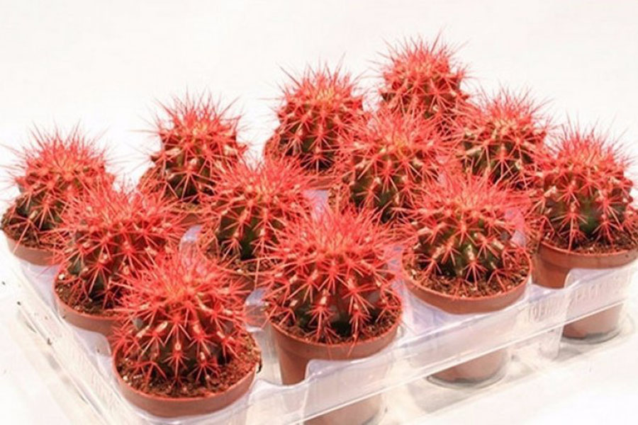Blomsterbutikker selger Gruzoni-kaktus med røde torner. Denne fargen på nålene er unaturlig for en kaktus. Det oppnås ved kunstig farging med matfarger som tilsettes sandjord.