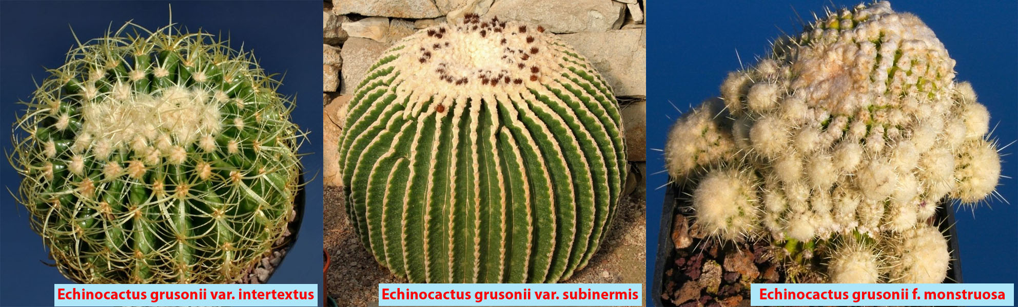 For eksempel har Echinocactus grusoniivar intertextus vakre buede pigger, Echinocactus grusoniivar subinermis, tvert imot, har veldig små pigger, Echinocactus grusonii f. monstruosa skiller seg ut ved at den vokser i forskjellige retninger, har korte gulhvite pigger og en kant.