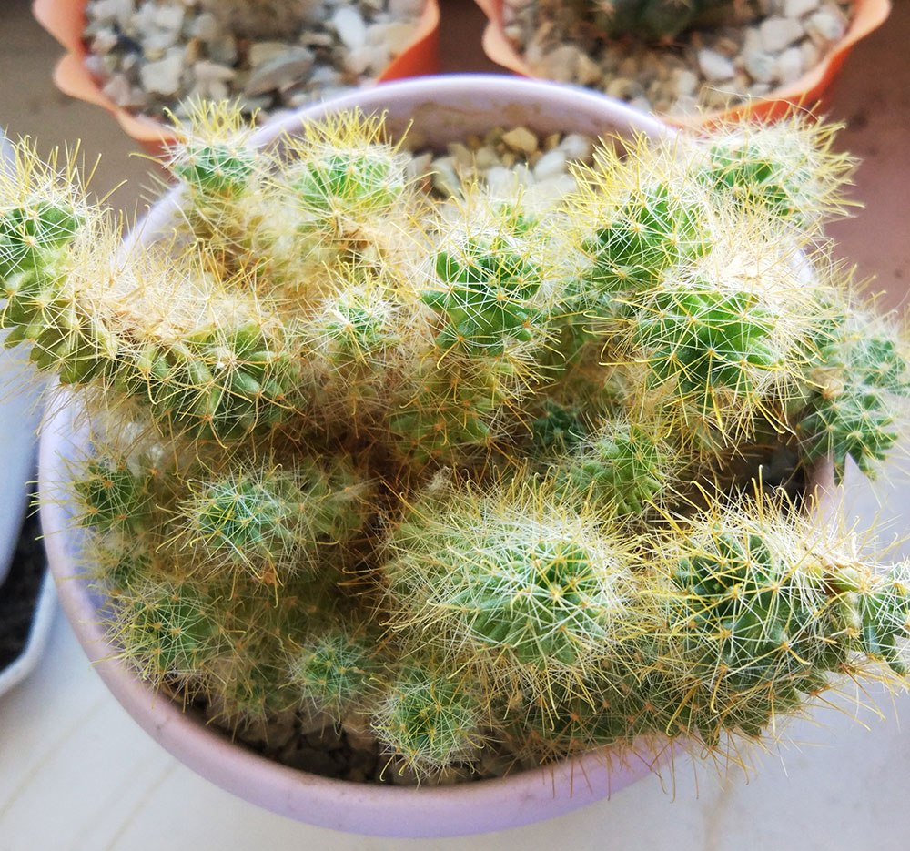 Forskjellen mellom denne arten er tilstedeværelsen av myke sfæriske stilker og små sylindriske tuberkler. På toppen av hver tuberkel er det en eller to røde pigger, som er omgitt av et hvitt og veldig fint hår. Lengden når 2 cm, i en pakke kan de være opptil 50 og enda mer.