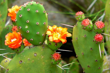 En annen spiselig kaktus er Opuntia. Hans hjemland er Nord-Afrika, spesielt Tunisia. Det andre navnet er Barbary fig. Sukkulent blomstrer opptil tre ganger i året. Fruktene er dannet på kantene av flate blader og er pæreformede. Den gjennomsnittlige størrelsen på Opuntia-frukten er ca 7 cm, fargen på skallet kan variere fra gulaktig til mørkerød, avhengig av Opuntia-sorten. Det samme gjelder for massen av planten - den kan være gul, grønn, hvit, rød eller til og med lilla. Smaken av kaktusfrukt med piggete pærer ligner et kryss mellom jordbær og kiwi. Bærene blir spist ferske eller gjort til konserver, syltetøy og drikke. For emner kan kaktusstengler også brukes.