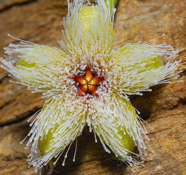 Kronbladene er trekantede (langstrakte).Tykke røde hår ligger på overflaten. Langs kanten av villi er det hvitt.