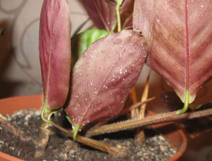 Edderkoppmidd legger seg også på undersiden av bladplatene, tynne spindelvev rapporterer dette, dette er på grunn av den lave luftfuktigheten i rommet. Bladene begynner å bli gule og smuldre. For å unngå å bli rammet av en edderkoppmidd, sprayes bladene på begge sider, ordne en varm dusj hver 2-3 dager.