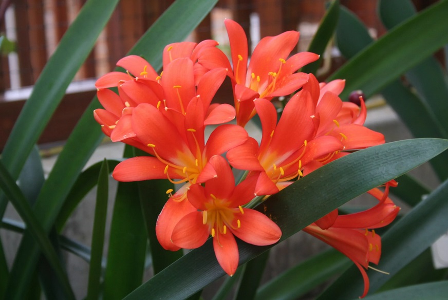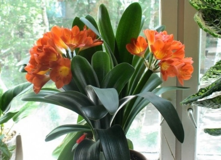 Bladene til en vakkert blomstrende kultur er blåst ut. Deres særegne trekk er deres unike dekorative effekt. Denne blomsten kan brukes til å dekorere det indre av rommet. Lyse, munter oransje clivia-blomsterstand er omgitt av skinnende mørkegrønne kronblad.