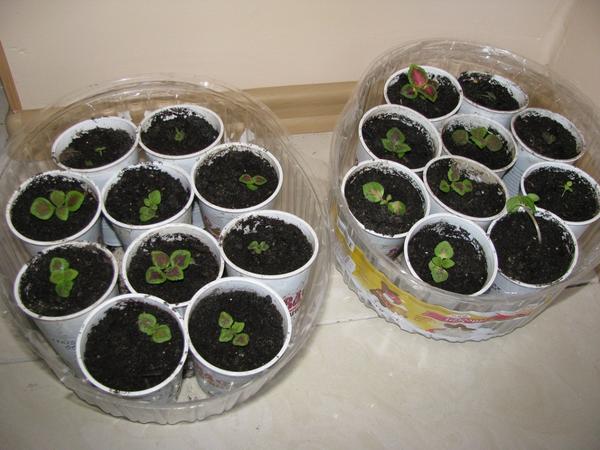 Når blomstene vokser opp, sitter de i beholdere i en avstand på 2 cm fra hverandre. Hvis coleus har to blader, kan den transplanteres i separate potter med en diameter på 7 cm. Etter en ny måned plantes spirene i en beholder med en diameter på 11 cm.