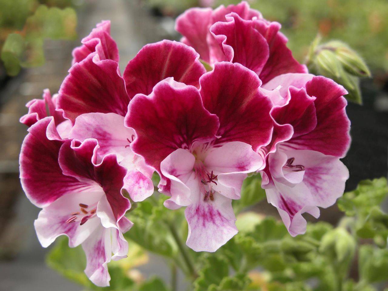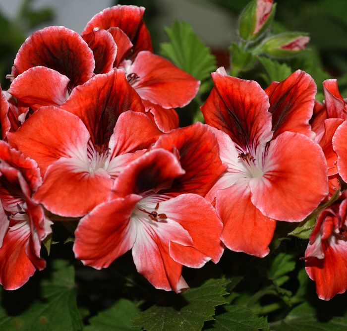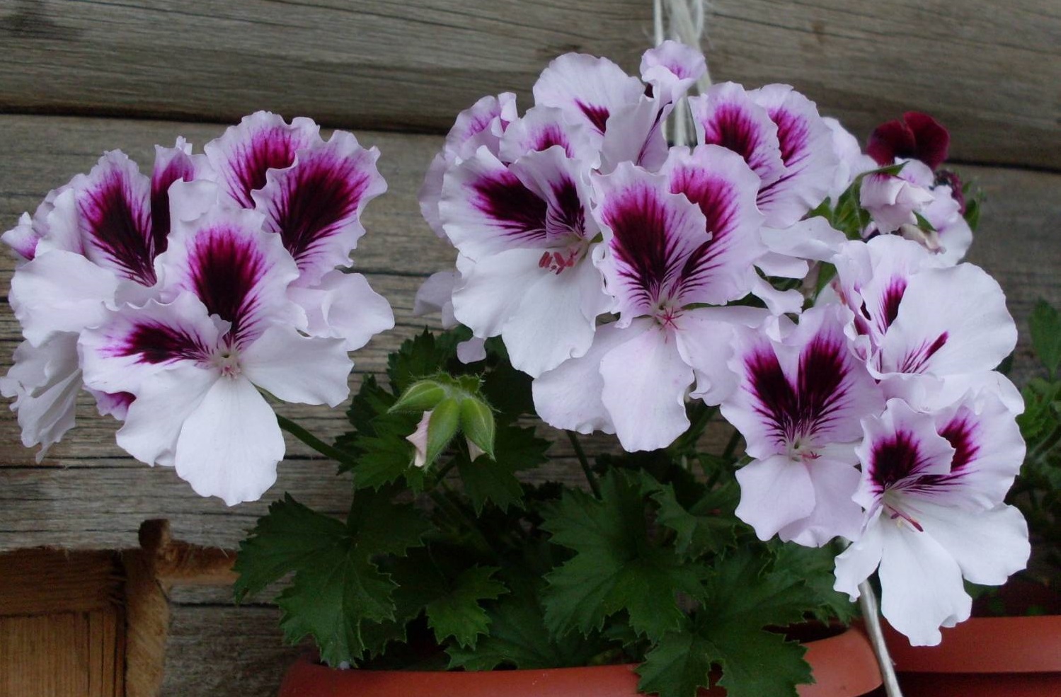 Blomstene er mindre enn kongelige pelargoner og har hvite eller røde farger.