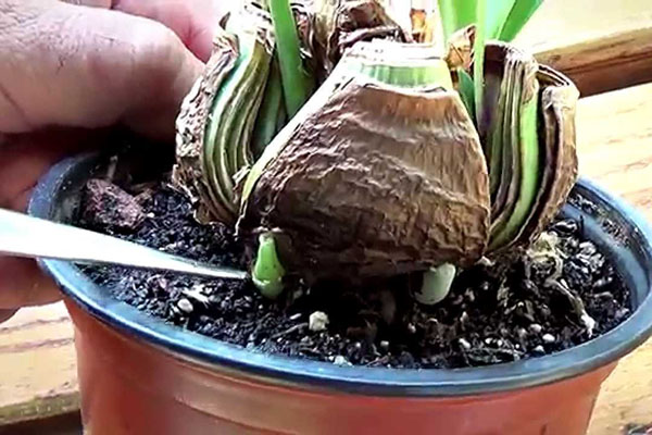 - Pæren skal behandles med varmt vann ved en temperatur på 43-45 grader i 3 timer. For det meste av hippeastrum fremmer slik pleie blomstring 20-25 dager etter prosedyrene.