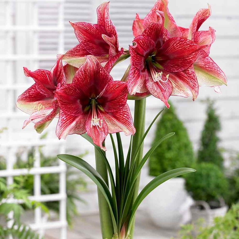 Hippeastrum rød med hvite flekker eller i andre nyanser passer perfekt inn i interiøret. Det er viktig å sette en vakker kultur utenfor rekkevidde for barn og kjæledyr, siden saften av alle deler av planten er giftig.