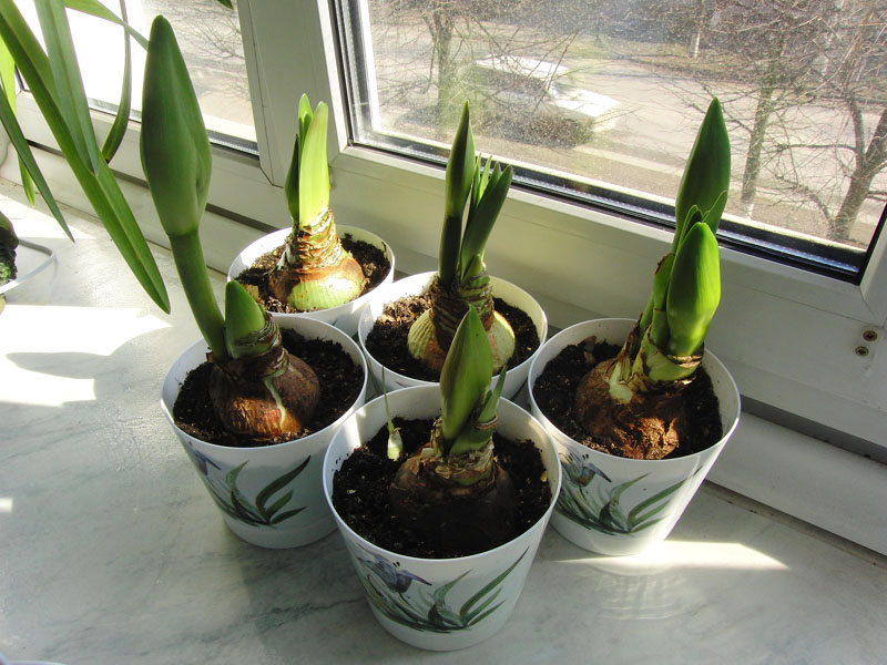 På grunn av den sterke og tunge stammen kan beholderen falle, så du må velge en tung og holdbar planter. Å plante flere frøplanter i en pott er ikke ekskludert. Beholderens størrelse avhenger av pæren. Bunndiameteren skal være 3-5 cm større enn hodet, 20-30 cm dyp. Hvis det er mer enn en blomst, tas det også hensyn til avstanden på 2-3 cm mellom pærene. Du kan kjøpe et fartøy med innsnevret nakke. For at røttene skal få næring med oksygen, er det bedre å ta uglaserte keramiske tallerkener.