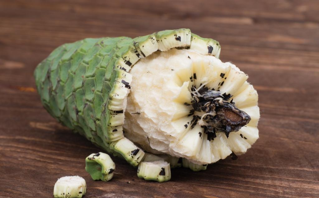 I form ligner bæren et kornør, på toppen er de dekket med tette skalaer, lengden varierer fra 20 til 40 cm og opp til 9 cm i diameter.Fruktmassen er saftig, søt i smak, og minner om en blanding av ananas og banan, litt jackfrukt.