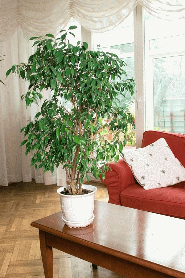 Stuen vil se mye mer attraktiv ut hvis du plasserer en blomsterpotte med en ficus i. Den gunstige atmosfæren skapt av blomsten vil gi gjestene et hyggelig tidsfordriv.