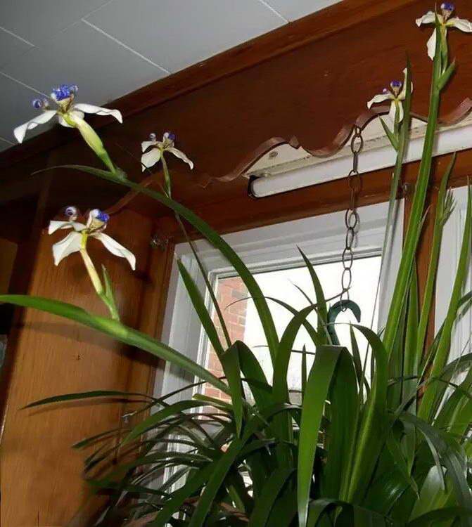 - broket hvit neomarica. Har brogede ark med hvite striper. Knoppene er hvite ispedd en blå fargetone.