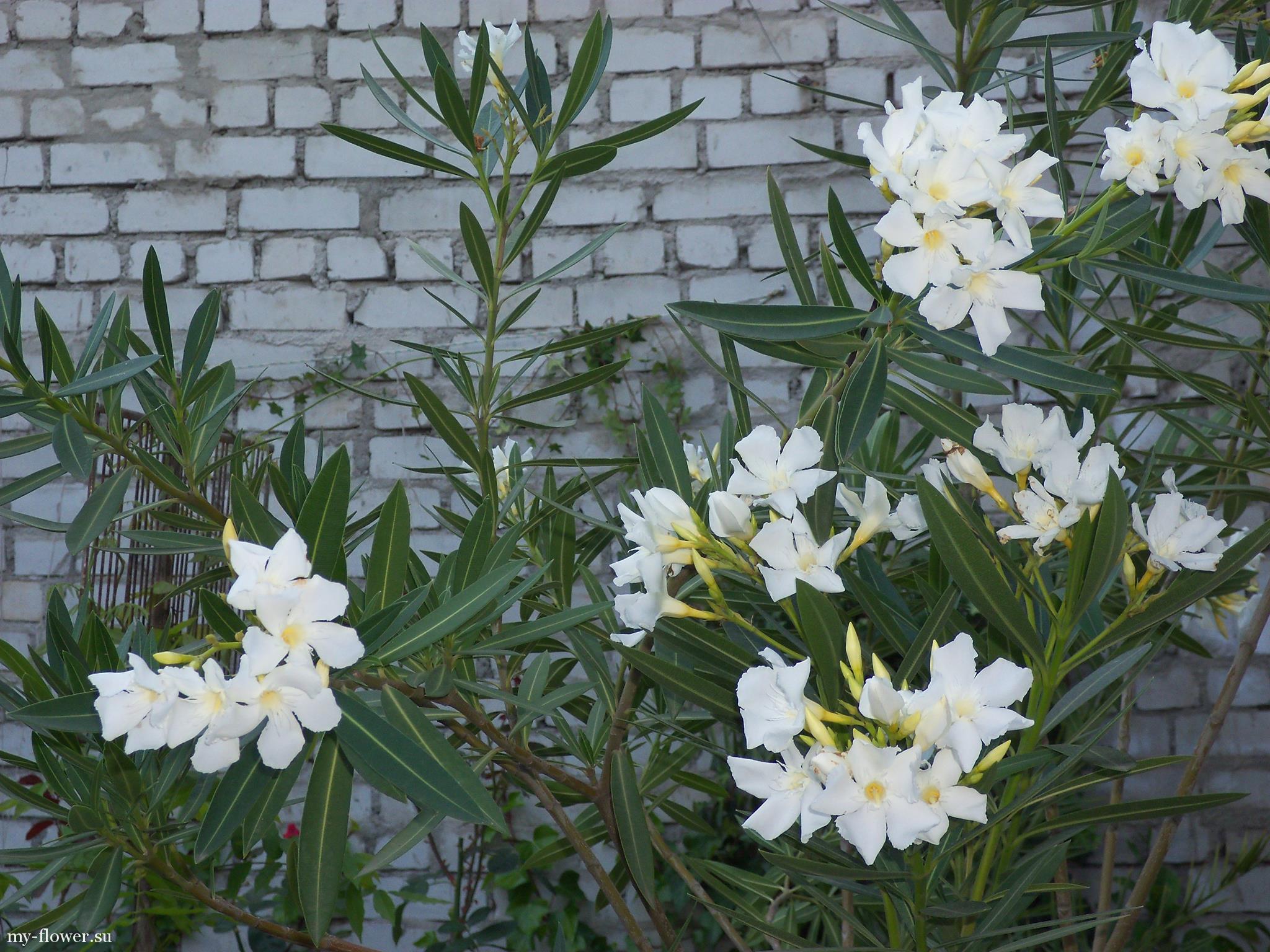 Den har store blomster, enkle eller doble, samlet i blomsterblomster. Hvit oleander har en sterk karamelllukt. De elsker å dyrke det i kontorbygg.