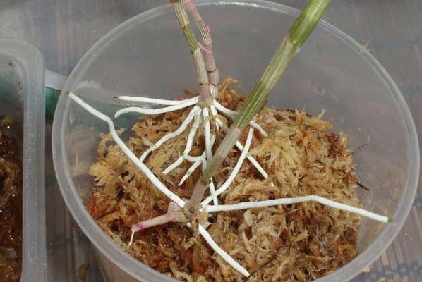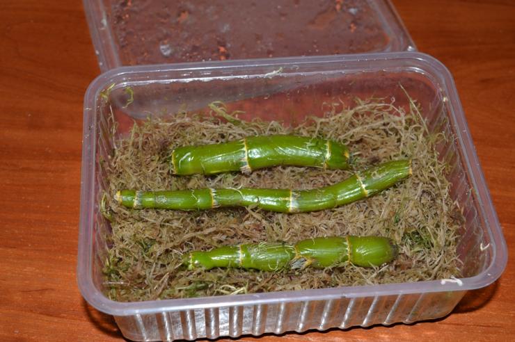 Stiklene plasseres direkte på sphagnum og sprayes med Epin vekststimulator. Beholderen plasseres deretter på et varmt sted.