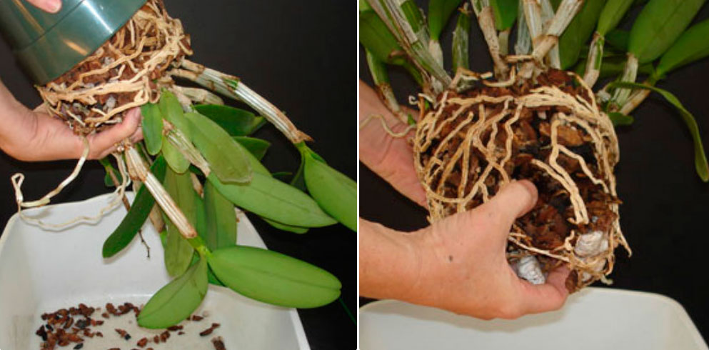 - Fjern orkideen forsiktig fra den gamle gryten;