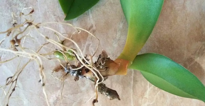 For å forhindre råte blir Phalaenopsis-blomsten av og til tatt ut av potten, og røttene undersøkes. De bortskjemte prosessene blir avskåret. Jorda må byttes ut. I den kalde årstiden reduseres vanningen, i den varme årstiden økes den. Med mangel på fuktighet blir orkideeblader tynnere og blir gule.