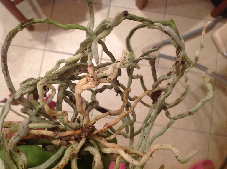 Kan røttene til en orkide beskjæres? Røtter er en spesiell del av enhver flora. De kan bare beskjæres når de transplanterer en plante. I dette tilfellet må du fjerne planten fra potten, rengjøre den fra jorden og fukte røttene med varmt vann. Sterke grønne røtter skal ikke berøres, men tørre eller råtne røtter må kastes.