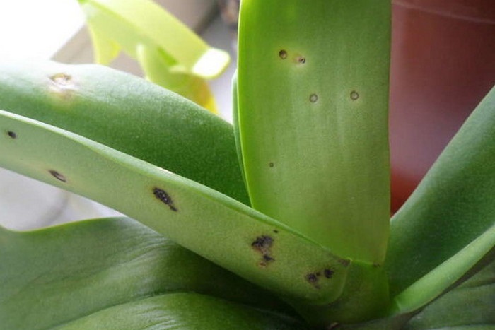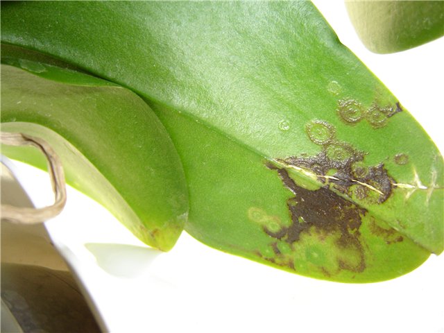 Når du transporterer om vinteren eller holder en orkide ved en temperatur på + 16 ° C, er det mulig å se spor etter frostskader på bladplatene i form av slimete, gelélignende flekker som øker i størrelse. For å bevare planten, bør du raskt begynne å gjenopprette blomsten.