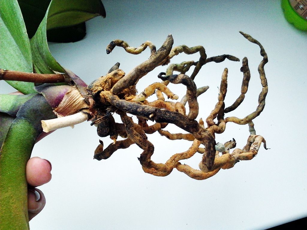 For å kontrollere røttene, må du fjerne blomsten fra potten, undersøke røttene nøye for å oppdage og fjerne råtne og tørkede, og behandle seksjonene med kanelpulver eller kull. Tilstedeværelsen av saltavleiringer fra gjødsel fjernes på samme måte. Du kan gjenopprette rotsystemet raskere ved å bruke et rotvekststimulerende middel.