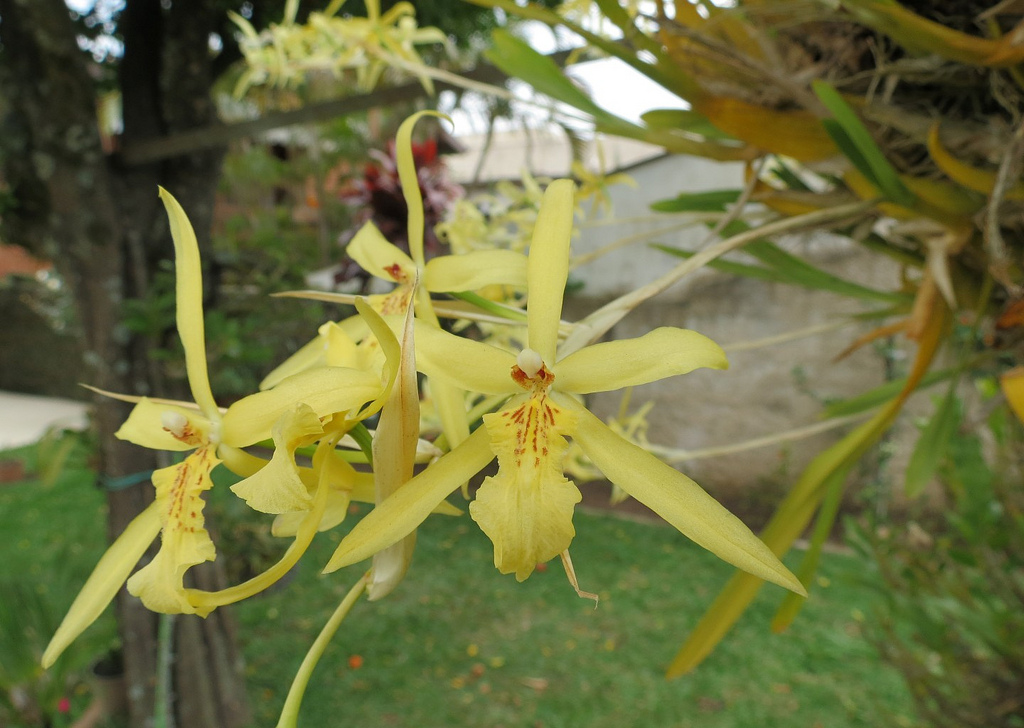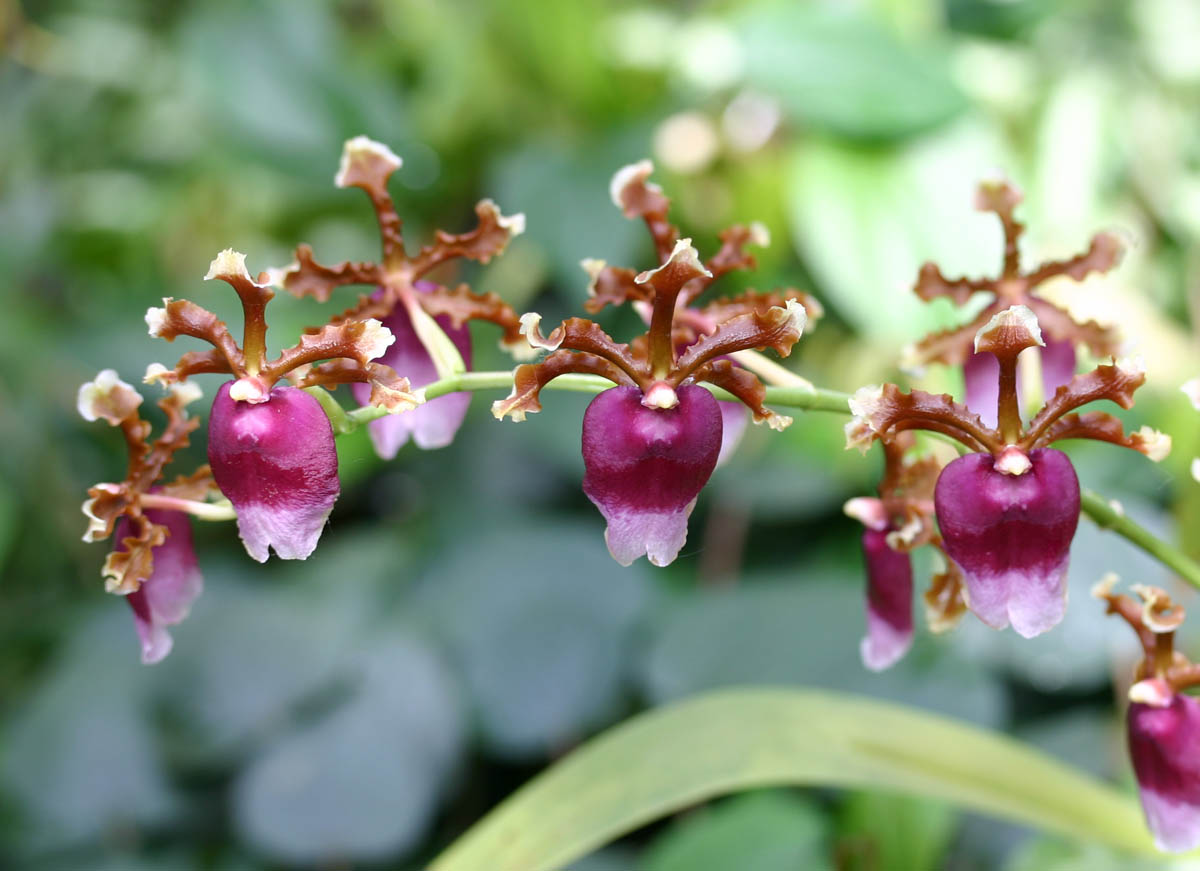 Orkideen er innfødt i Mellom-Amerika. Blader med avrundede ender er opptil 14 cm lange. Danner en flerblomstret blomsterstand, noen ganger forgrenet, med blomster opp til 4 cm i diameter. Kelkblad og kronblad er like, avlange i form med en forlengelse på enden. Malet i rødbrune, hvite og gule farger. Den lilla-lilla leppen er bred, bilobat med en hvit kant. I midten er en rødbrun plate. Blomstringen varer fra august til april. De mest aktive knoppene blomstrer fra februar til mars.