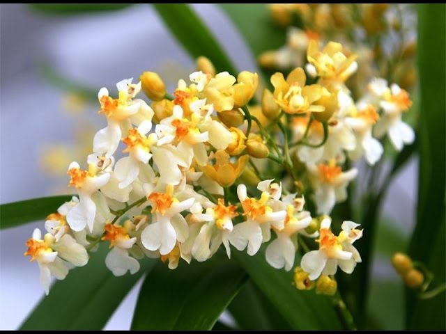 - Oncidium "bird-billed". Den kompakte planten fikk navnet sitt fra den langstrakte formen på blomstene. Knoppene er kremete. Aromaen er søt, sterk. Blomstringsperioden er om høsten og vinteren.