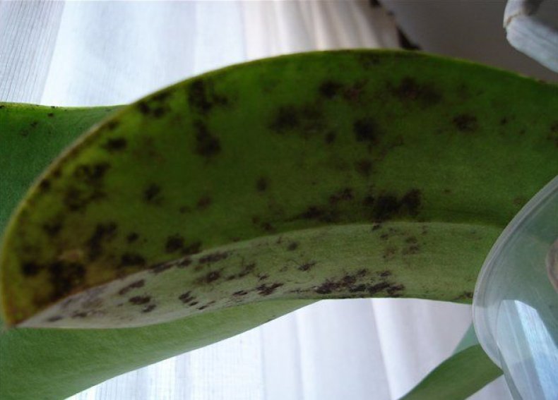 På en orkide kan svarte prikker på bladene indikere en av to sykdommer: klorose eller sen rødme. Ved sen rødme skifter bladene farge to ganger. Først blir de lilla og deretter svarte. Sykdommen oppstår på grunn av høy luftfuktighet. Med klorose krøller sorte blader seg i rør og faller av. Hvis du ikke reagerer på endringen i fargen på bladene, vil sykdommen utvikle seg og planten vil dø.