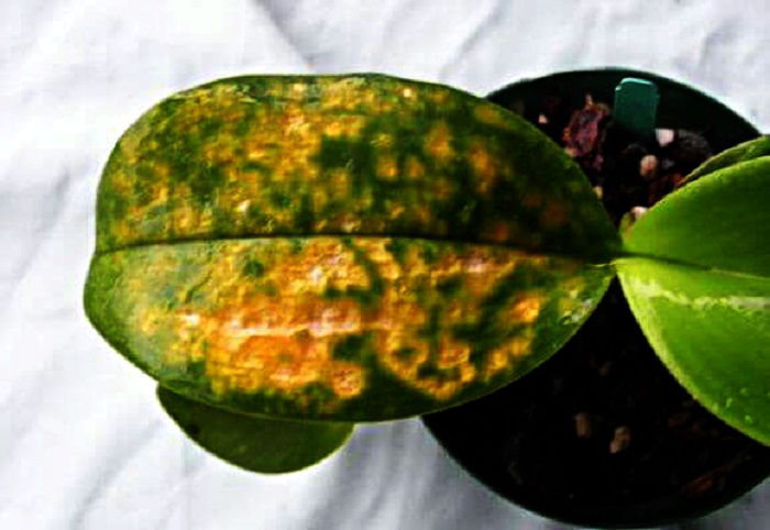 På en orkide er flekker på bladene et tegn på at planten har blitt smittet med patogene organismer. Inntrengningen av infeksjon skjer på forskjellige måter: