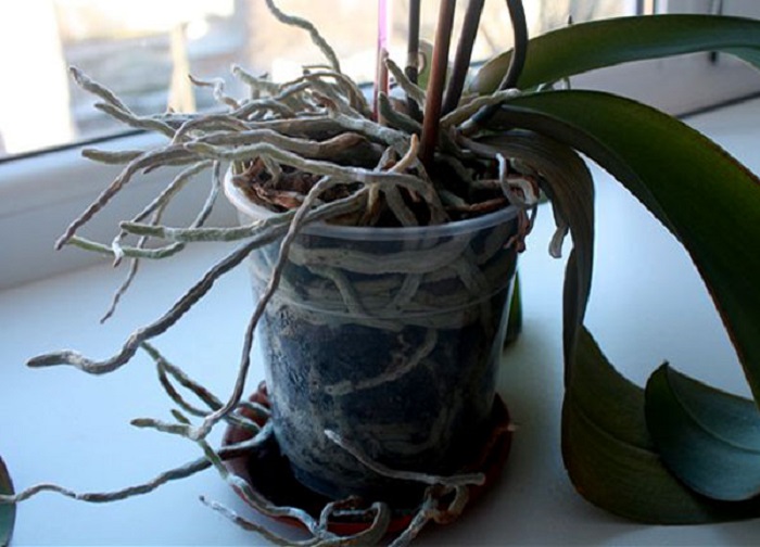 - Kanskje planten ikke ble transplantert på lang tid, underlaget ble overveldet og fortykket. Orkidens røtter har ikke nok oksygen, så planten er svekket.