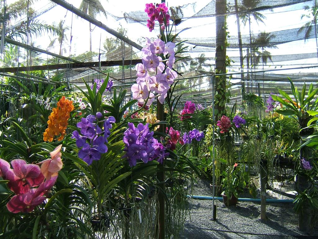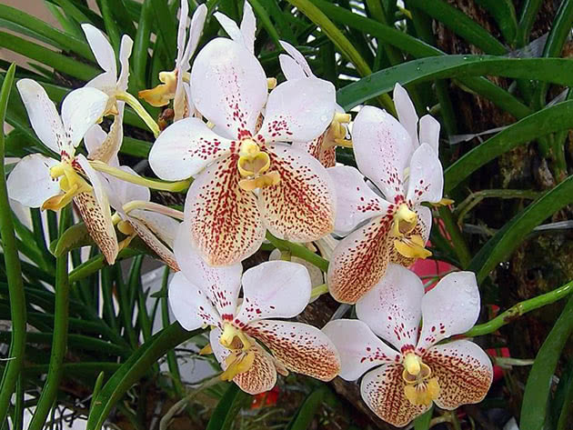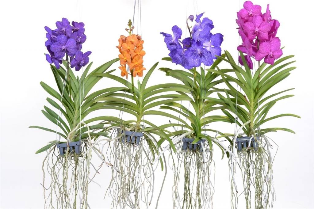 Sandera og Vanda tricolor (tricolor) er spesielt populære. En trefarget orkide av Vanda-arten når en høyde på 1,5 m. Bladene er store, plassert i to rader i forhold til stammen. Blomstene overstiger ikke 7 cm i diameter. 7-10 blomster av en veldig broket, uvanlig farge dannes i blomsterstanden.