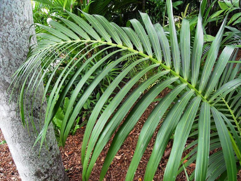 Planten har ganske tøffe blader opptil 4 m lange. Hver av dem har smale lobules. De nedre bladene blir gule når de vokser, faller av og det dannes stubber på plass. De faller også av og etterlater arr på kofferten.