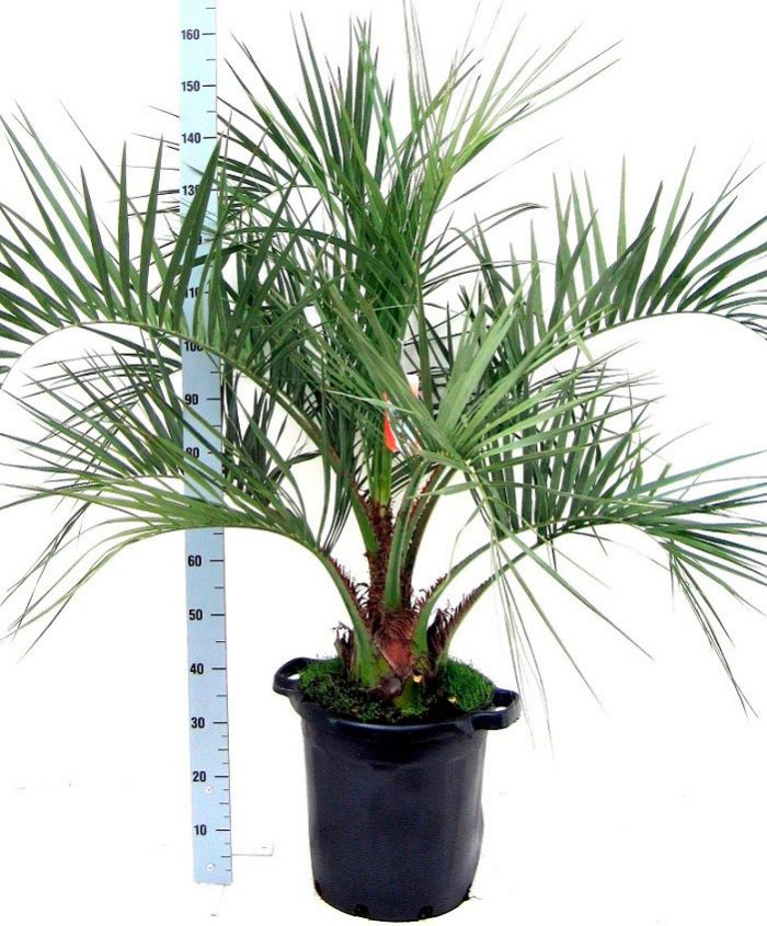 Denne dekorative palmen har blågrå blader. Det kan ofte blomstre; under blomstring kan antallet blomsterstander nå 100 eller enda mer.