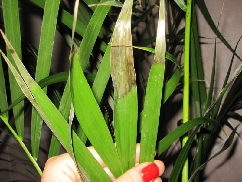 Når det gjelder sykdommer, lider areca-palmen ofte av sopp. Våt jord fremkaller rotting av rotsystemet. Dette problemet kan identifiseres ved flekker og nekrose på bladplaten. Deretter begynner de å bli gule, blekne. Sprøyting med soppdrepende løsning vil bidra til å rette opp situasjonen.