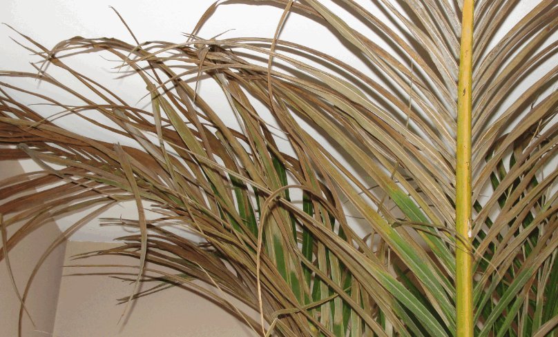 Hvis bladene på et palme blir gule, betyr dette at det enten var lite vannet, eller at det ble brukt utilstrekkelig mengde næringsdressing. Årsaken kan også være vanning med hardt vann og for tørr luft i rommet.